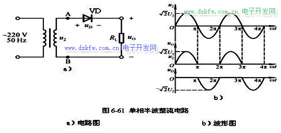 正半周u2瞬时极性上(+),下(-),D正偏导通,二极管和负载上有电流流过。负半周u2瞬时极性上(-),下(+),VD反偏截止,负载上得不到电流。负载RL上电压和电流波形为u2的半个周期,故称半波整流电路。 只适用于小电流整流电路、充电使用。