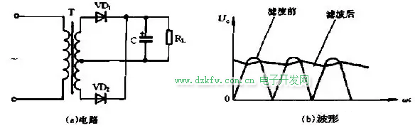 设v1为正半周时,图中A端为正,B端为负,则A端电位高于中心抽头C处电位,且C处电位又高于B端电位。二极管V1导通,V2截止,电流iV1自A端经二极管V1自上而下流过RL到变压器中心抽头C处;当v1为负半周时,B端为正、A端为负,则B端电位高于中心抽头C处电位,且C处电位又高于A端电位。二极管V2导通,V1截止,电流iV2自B端经二极管V2,也自上而下流过负载RL到C处,iV1和iV2叠加形成全波脉动直流电流iL,在RL两端产生全波脉动直流电压vL。
