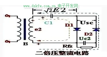 e2正半周(上正下负)时,二极管D1导通,D2截止,电流经过D1对C1充电,将电容Cl上的电压充到接近e2的峰值√2E2 ,并基本保持不变。e2为负半周(上负下正)时,二极管D2导通,Dl截止。此时,Cl上的电压Uc1=√2E2与电源电压e2串联相加,电流经D2对电容C2充电,充电电压Uc2=e2峰值+1.2E2≈ 2√2E2。如此反复充电,C2上的电压就基本上是2√2E2 了。它的值是变压器电级电压的二倍,所以叫做二倍压整流电路。