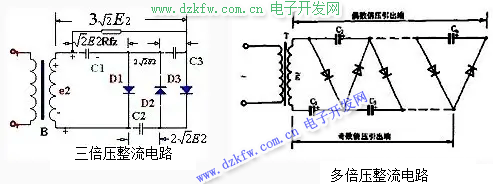 在一些需用高电压、小电流的地方,常常使用倍压整流电路。倍压整流,可以把较低的交流电压,用耐压较低的整流二极管和电容器,“整”出一个较高的直流电压。倍压整流电路一般按输出电压是输入电压的多少倍,分为二倍压、三倍压与多倍压整流电路。