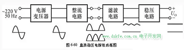 后向调整电路(稳压电路)输送一个不稳定的脉动的直流电压ui。因ui或稳压电路输出电流 I0的变动而引起输出电压u0变化时,调整电路使u0保持原值或者只有极小的变动。调整电路中的调整管工作在线性放大区的称为线性电源,工作在非线性区的则称为开关电源。线性电源分为简单稳压电路、并联稳压电路、串联稳压电路和集成化稳压电路。