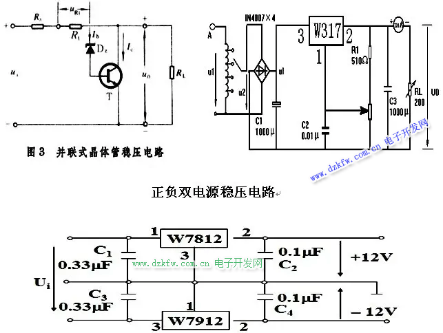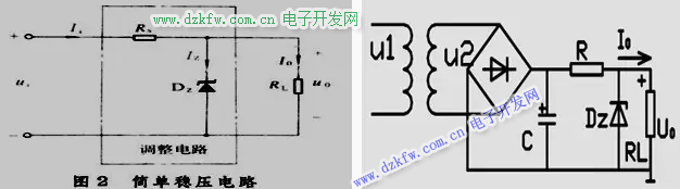 图2为简单稳压电路,由限流电阻 Rs和稳压二极管Dz组成。输出端输出稳压电压。当输入电压ui或输出电流I0在一定范围内升高或降低时,具有稳压特性的Dz上的电压 。