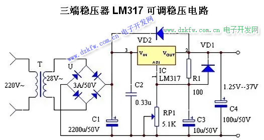 LM317是可调节三端正电压稳压器,在输出电压范围1.2伏到37伏时能够提供超过1.5安的电流。R2/R1的比值范围只能是0—28.6;317系列稳压块的型号很多:例如LM317HVH、W317L 、LM317HVA、LM317HVK等 。