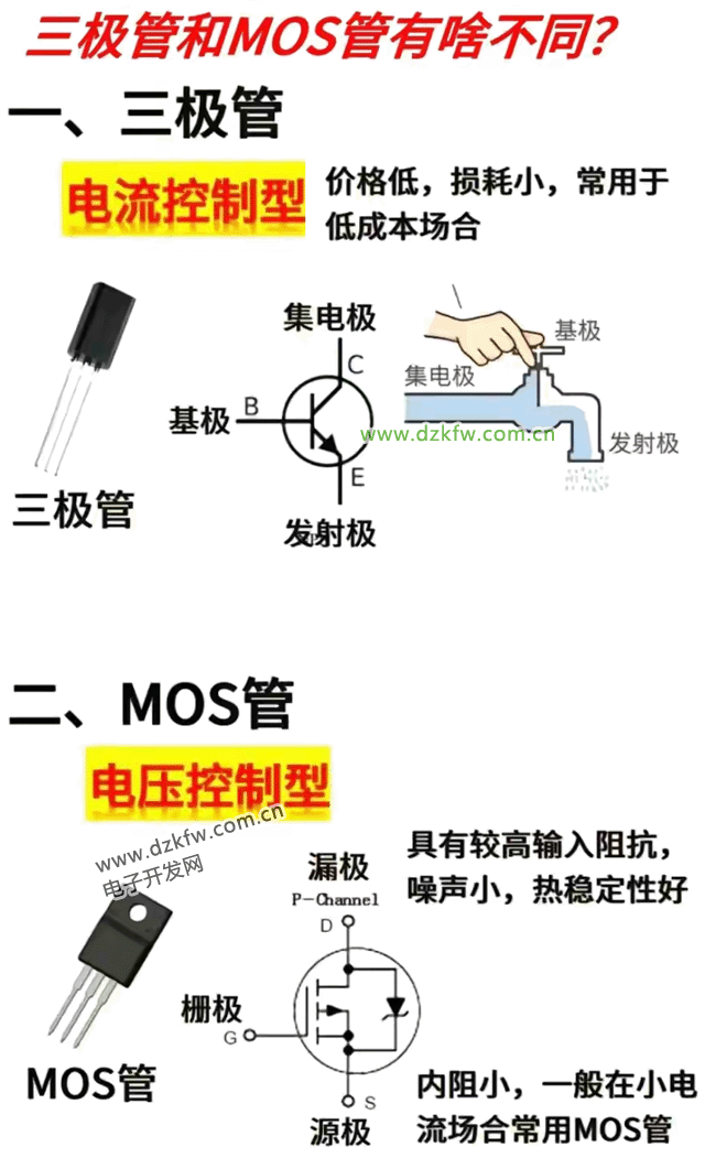 三极管靠电流控制,MOS管靠电压控制,就像三极管听爸妈的话,MOS管听老师的话。