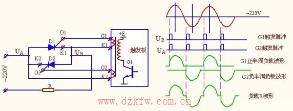 对于交流可控整流输出电路或交流调压电路,其主回路都含有2只可控硅器件作为正负半周的可控整流器件,由于这二个可控硅的阴极不为同电位,故需用2路独立的触发信号,来分别触发这2只可控硅。图中的G1、K1与G2、K2即为2路独立的触发信号的引线端。其与可控硅连线为:G1与K1接第一个可控硅的栅极与阴极,G2与K2接第二个可控硅的栅极与阴极,请见下图的可控硅与触发板的连线:该图为可控硅交流调压电路,主回路有2只反并联可控硅组成,其D1管的栅极接触发板的G1引线端,D1管的阴极接触发板的K1引线端,D2管的栅极接触发板的G2引线端,D2管的阴极接触发板的K2引线端,D1与D2这二个可控硅是分别工作电源电压的正负半周: