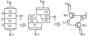可控硅是P1N1P2N2四层三端结构元件,共有三个PN结和三个电极——阳极(A)、阴极(K)和控制极(G),如图1所示。可控硅在控制原理上可等效为一只 PNP 三极管和一只 NPN 三极管的连接电路, 两管的基极电流和集电极电流互为通路,具有强烈的正反反馈作用。一旦给 G、K 回路的 NPN 管子输入基极电流,由于正反馈作用,两管将迅即进入饱合导通状态。可控硅导通之后,它的导通状态完全依靠管子本身的正反馈作用来维持,即使控制电流(电压)消失,可控硅仍处于导通状态。控制信号的作用仅仅是触发可控硅使其导通,导通之后,控制信号便失去控制作用。