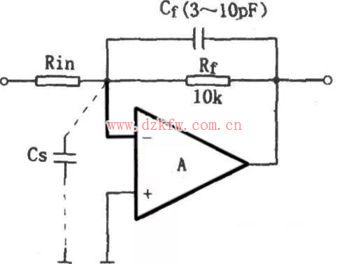 一般线性工作的放大器(即引入负反馈的放大电路)的输入寄生电容Cs会影响电路的稳定性,其补偿措施见图。放大器的输入端一般存在约几皮法的寄生电容Cs,其频带的上限频率约为: