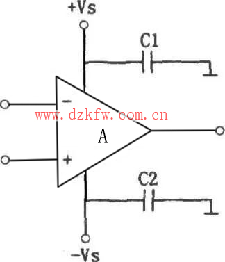 每个集成运放的电源引线,一般都应采用去偶旁路措施,如图所示图中的高频旁路电容,通常可选用高频性能优良的陶瓷电容,其值约为0.1μF。或采用lμF的钽电容。这些电容的内电感值都较小。在运放的高速应用时,旁路电容C1和C2应接到集成运放的电源引脚上,引线尽量短,这样可以形成低电感接地回路。