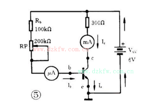 三、三极管自身并不能把小电流变成大电流,它仅仅起着一种控制作用,控制着电路里的电源,按确定的比例向三极管提供 I b 、 I c 和 I e 这三个电流。为了容易理解,我们还是用水流比喻电流(见图 4 )。这是粗、细两根水管,粗的管子内装有闸门,这个闸门是由细的管子中的水量控制着它的开启程度。如果细管子中没有水流,粗管子中的闸门就会关闭。注入细管子中的水量越大,闸门就开得越大,相应地流过粗管子的水就越多,这就体现出“以小控制大,以弱控制强”的道理。由图可见,细管子的水与粗管子的水在下端汇合在一根管子中。三极管的基极 b 、集电极 c 和发射极 e 就对应着图 4 中的细管、粗管和粗细交汇的管子。电路见图 5 ,若给三极管外加一定的电压,就会产生电流 I b 、 I c 和 I e 。调节电位器 RP 改变基极电流 I b , I c 也随之变化。由于 I c = βI b ,所以很小的 I b 控制着比它大 β 倍的 I c 。 I c 不是由三极管产生的,是由电源 V CC 在 I b 的控制下提供的,所以说三极管起着能量转换作用。