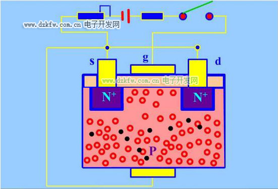 判定源极S、漏极D:在源-漏之间有一个PN结,因此根据PN结正、反向电阻存在差异,可识别S极与D极。用交换表笔法测两次电阻,其中电阻值较低(一般为几千欧至十几千欧)的一次为正向电阻,此时黑表笔的是S极,红表笔接D极。