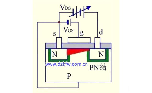 (4)VGS》0且VDS增大到一定值后,靠近漏极的沟道被夹断,形成夹断区。