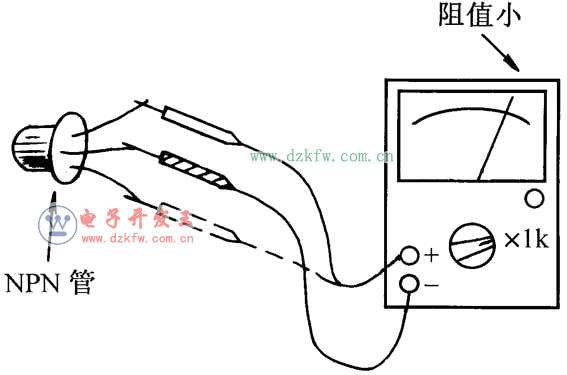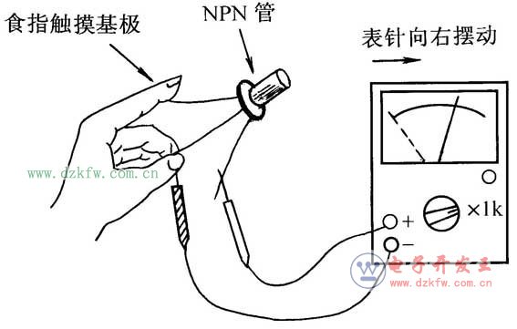 [8] 接着,对于NPN管,用红表笔接基极以外的一管脚,左手拇指与中指将黑表笔与基极捏在一起,同时用左手食指触摸余下的管脚,这时表针应向右摆动。将基极以外的两管脚对调后再测一次。两次测量中,表针摆动幅度较大的那一次,黑表笔所接为集电极,红表笔所接为发射极。表针摆动幅度越大,说明被测三极管的β值越大。对于PNP管则对调红、黑表笔测量。