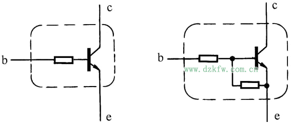 [12] 带阻三极管是一种内部包含有一个或几个电阻的晶体三极管,近年来在家用电器和音像设备中应用较多。图示为较常见的两种带阻三极管内部电路结构。