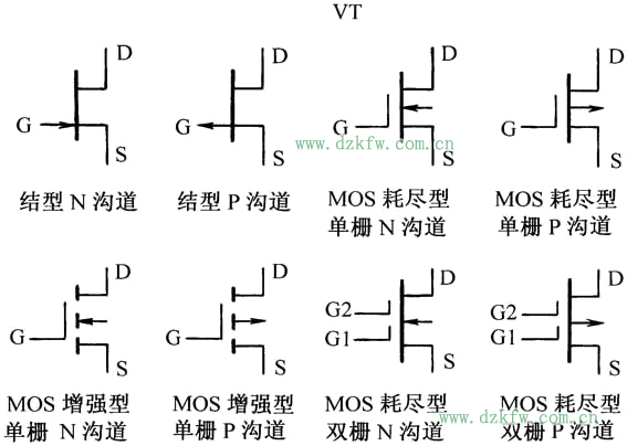 [13] 场效应晶体管通常简称为场效应管,是一种利用场效应原理工作的半导体器件。和普通双极型晶体管相比较,场效应管具有输入阻抗高、噪声低、动态范围大、功耗小、易于集成等特点,得到了越来越广泛的应用。场效应管的文字符号也为“VT”,图形符号如图所示。