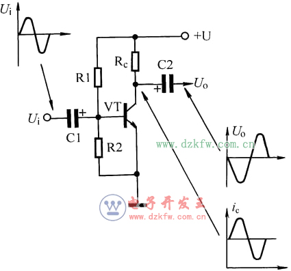 [9] 晶体三极管最基本的作用是放大。图示为晶体三极管放大电路,输入信号Ui经C1加至三极管VT基极,使其集电极电流相应变化,并在集电极负载电阻Rc上产生压降,经C2输出。由于输出电压等于电源电压与Rc上压降的差值,因此输出电压Uo与输入电压Ui相位相反。R1、R2为VT的基极偏置电阻。