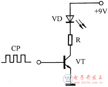 [10] 晶体三极管具有开关作用。图示为驱动发光二极管的电子开关电路,开关管VT的基极由脉冲信号CP控制,当CP=“1”时,VT导通,发光二极管VD发光;当CP=“0”时,VT截止,发光二极管VD熄灭。R为限流电阻。