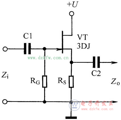 [18] 场效应管很高的输入阻抗非常适合作阻抗变换。图示为场效应管源极输出器,其特点是输入阻抗Zi很高、输出阻抗Zo较低,常用于多级放大器的输入级作阻抗变换。