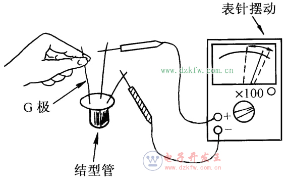 [17] 估测结型场效应管的放大能力:万用表置于“R×100”挡,两表笔分别接漏极D和源极S,然后用手捏住栅极G(注入人体感应电压),表针应向左或向右摆动。表针摆动幅度越大说明场效应管的放大能力越大。如果表针不动,说明该管已坏。