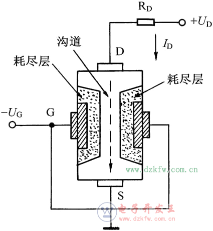 [15] 场效应管的基本工作原理如图示(以结型N沟道管为例)。由于栅极G接有负偏压UG,在G附近形成耗尽层。当负偏压UG增大时,耗尽层增大,沟道减小,漏极电流ID减小;当负偏压UG减小时,耗尽层减小,沟道增大,漏极电流ID增大。漏极电流ID受栅极电压的控制,所以场效应管是电压控制器件。