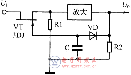 [19] 场效应管可以用作可变电阻。图示为录音机自动电平控制电路,当输入信号Ui增大导致Uo增大时,由Uo经VD负向整流后形成的栅极偏压-UG的绝对值也增大,使场效应管VT的等效电阻增大,R1与其的分压比减小,使进入放大器的信号电压减小,最终使Uo保持基本不变。