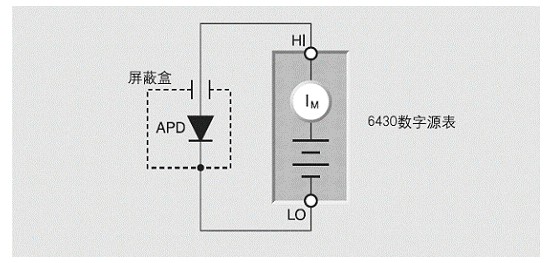雪崩光电二极管(APD)是一种高灵敏度、高速度的光电二极管。施加反向电压时,能启动其内部的增益机构。APD的增益可以由反向偏置电压的幅度来控制。反向偏置电压越大增益就越高。APD在电场强度的作用下工作,光电流的雪崩倍增类似于链式反应。APD应用于对光信号需要高灵敏度的各种应用场合,例如光纤通讯、闪烁(scinTIllaTIon)探测等。 对APD的测量一般包括击穿电压、响应度和反向偏置电流等。典型APD的最大额定电流为10-4到10-2A,而其暗电流则可低达10-12到10-13A的范围。最大反向偏置电压随APD的材料而变化,铟砷化镓(InGaAs)材料的器件可达100V,硅材料的器件则可高达500V。 测试介绍 测量APD的反向偏置电流需要一种能够在很宽范围内测量电流并且能输出扫描电压的仪器。由于这种要求,吉时利6487型皮安计电压源或者6430型亚飞安(Sub-Femtoamp)源-表等仪器对于这类测量工作是非常理想的。 图4-19 所示为6430型亚飞安源-表连接到一个光电二极管上。该光电二极管安放在一个电屏蔽的暗箱中。为了对敏感的电流测量进行屏蔽,使其不受静电干扰的影响,将此暗箱与6430型亚飞安源表的低端相连。