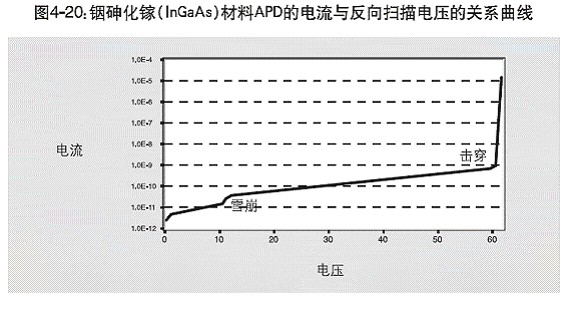 图4-20示出使用6430型数字源表测量得到的铟砷化镓(InGaAs)材料APD的电流与反向扫描电压的关系曲线,注意其电流测量的范围很宽。随着光的增强,雪崩区域变得更加明显。击穿电压将引起电流自由流动,因为这时会形成电子空穴对,而不再需要光照射二极管来产生电流。