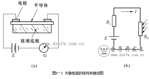 光敏电阻又称为光导,几乎都是用半导体材料制成。光敏电阻的结构和接线图如图9‐2所示。