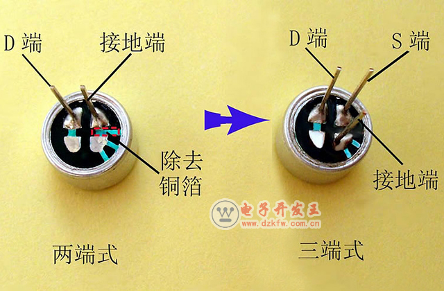 7.在电子制作或维修时,如果发现所用的三端式驻极体话筒已经损坏,而手头一时没有合适的替换品,可不妨用一个大小相同、灵敏度等主要参数相近的普通两端式驻极体话筒加工改造后代替,具体方法:按照图4所示,用刻刀划断两端式驻极体话筒背面与金属外壳相连的焊脚敷铜箔,给金属外壳焊接上独立的引线,则原有的两个焊脚加上金属外壳(接地端),就构成了一个三端式驻极体话筒。
