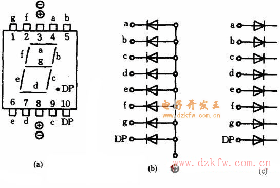 图中(b)属于共阳极结构,(c)采用共阴极结构。a~g是7个笔段电极,DP为小数点。另有一种字高为7.6mm的超小型LED数码管,管脚从左右两排引出,小数点则是独立的。