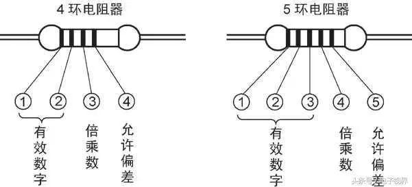 技巧2:棕色环是否是误差标志的判别。棕色环既常用做误差环,又常作为有效数字环,且常常在第一环和最末一环中同时出现,使人很难识别谁是第一环。在实践中,可以按照色环之间的间隔加以判别:比如对于一个五道色环的电阻而言,第五环和第四环之间的间隔比第一环和第二环之间的间隔要宽一些,据此可判定色环的排列顺序。