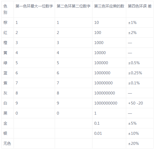 碳质电阻和一些1/8瓦碳膜电阻的阻值和误差用色环表示。在电阻上有三道或者四道色环。靠近电阻端的是第一道色环,其余顺次是二、三、四道色环,如图1所示。第一道色环表示阻值的最大一位数字,第二道色环表示第二位数字,第三道色环表示阻值未应该有几个零。第四道色环表示阻值的误差。色环颜色所代表的数字或者意义见表1。