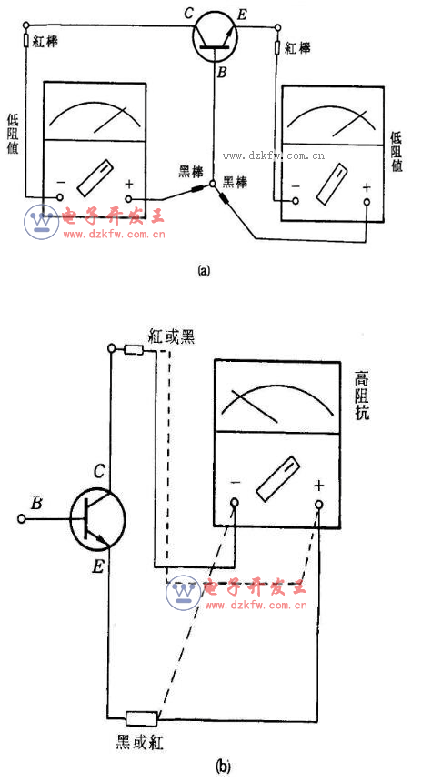 将万用表的红棒(-)和黑棒(+)测三极管的任意两支管脚(1K档),若呈低阻值,则其中有一脚为基极(B)。之后,将红棒(-)移至第三支脚,若仍呈低电阻,则未移动的黑棒所接的脚为基极,并得知此三极管为NPN型,如下图(a)所示。 (此时万用表表置于R x 1K档)。剩下的二支脚( E和C )如何判别呢?详见-怎么判断三极管的发射极与集电极 。如何检测好坏:1,判断集电极-发射极之间漏电,您找到集电极和发射极后,您若直接用万用表测这二支引脚,无论极性如何对换,均呈高阻值。如下图(b)所示。