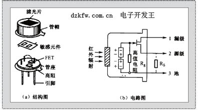 由于热释电传感器内部都带有用于阻抗变换的场效应管,故这种传感器在使用时一般都要接入合适的直流电压才能工作。另外,这种传感器输出的电信号非常微弱,一般还要经运算放大器或专用的热释电红外信号处理IC——BISS0001放大后才能控制负载工作。