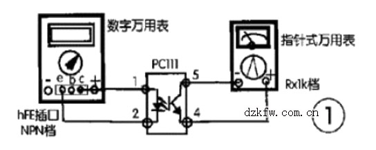 2、数字万用表检测法下面以EL817光耦检测为例来说明数字万用表检测的方法,检测电路如图1所示。检测时将光耦内接二极管的+端{1}脚和-端{2}脚分别插入数字万用表的Hfe 的c、e插孔内,此时数字万用表应置于NPN挡;然后将光耦内接光电三极管C极{5}脚接指针式万用表的黑表笔,e极{4}脚接红表笔,并将指针式万用表拨在RX1k挡。这样就能通过指针式万用表指针的偏转角度——实际上是光电流的变化,来判断光耦的情况。指针向右偏转角度越大,说明光耦的光电转换效率越高,即传输比越高,反之越低;若表针不动,则说明光耦已损坏。