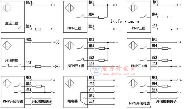 下图为接近开关的种类,直流交流,NPN三线,PNP三线,