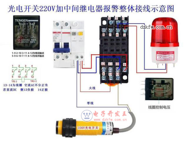 大家看下图:两线制接近开关,用到220V常开型接近开关,当物体靠近接近开关常开点闭合,同时中间继电器得电,警报器得电工作