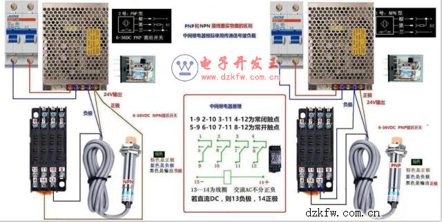 我们继续看右图,电源进开关电源,经过开关电源变压,整流,输出为直流24V,负极接接近开关蓝色,同时并联到继电器线圈13。正极接接近开关棕色线,黑色线进继电器线圈14。这里重点说明,接近开关。棕色----正极 蓝色---负极 黑色输出正极。工作原理当物体靠近接近开关,触点闭合接近开关输出正极,由于负极直接进继电器,所以继电器得电工作。停止:当物体离开接近开关,接近开关触点断开,停止输出正极,继电器失电停止工作。