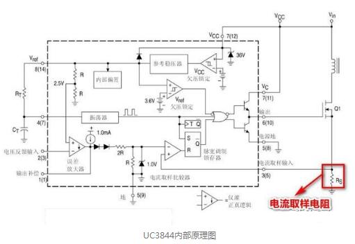 如下图是开关电源芯片UC3844内部原理图,这里的Rs就是一个取样电阻,UC3844是一款具有电流取样比较器的高性能芯片,作用是通过此反馈电流信号来调节脉宽调制器的开关导通情况。