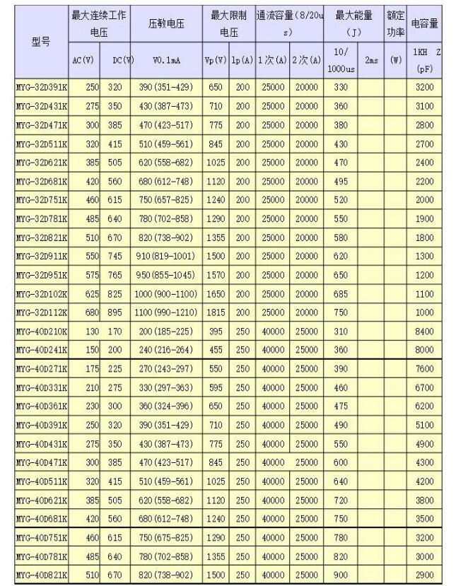 下面给出一组压敏电阻具体型号及参数表,以供选型使用,具体如下表所示: