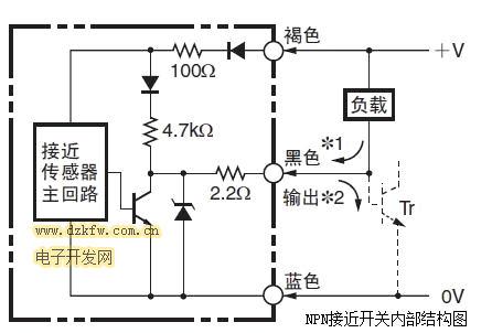 没有感应信号时:接近传感器主回路没有信号(即低电平),内部NPN三极管不导通,输出高电平,负载不导通