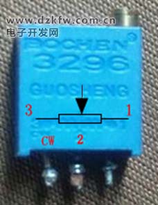 它和普通的可调电位器作用相同,调整钮在图的右上方,调整时可用一字螺丝刀旋转进行调整。接线脚有3个,2脚为动臂。标示如上图。CW标示动臂2向3移动时,是顺时针旋转调整钮。