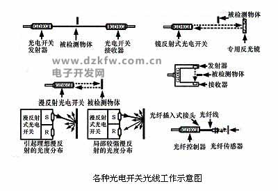 利用光学元件,在传播媒介中间使光束发生变化;利用光束来反射物体;使光束发射经过长距离后瞬间返回。光电开关是由发射器、接收器和检测电路三部分组成。发射器对准目标发射光束,发射的光束一般来源于发光二极管(LED)和激光二极管。光束不间断地发射,或者改变脉冲宽度。受脉冲调制的光束辐射强度在发射中经过多次选择,朝着目标不间接地运行。接收器有光电二极管或光电三极管组成。在接收器的前面,装有光学元件如透镜和光圈等。在其后面的是检测电路,它能滤出有效信号和应用该信号。