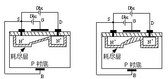 耗尽型MOS场效应管,是在制造过程中,预先在SiO2绝缘层中掺入大量的正离子,因此,在UGS=0时,这些正离子产生的电场也能在P型衬底中“感应”出足够的电子,形成N型导电沟道。