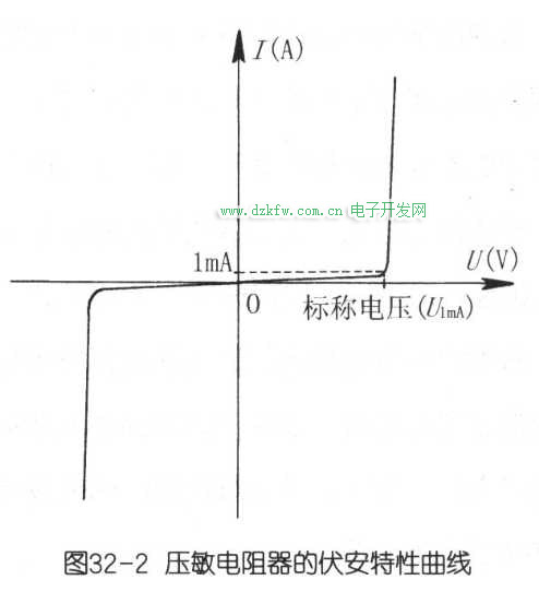 压敏电阻器的伏安特性曲线如图32-2所示。我们知道,普通电阻器两端接上电压时,流过电阻器的电流与所加电压的关系成正比(即遵从欧姆定律),其伏安特性呈线性。但压敏电阻器截然不同,它的伏安特性不遵从欧姆定律,而是呈特殊的非线性关系。当压敏电阻器两端所加电压在标称电压(临界数值)以内时,其电阻值几乎为无穷大,仅有微安级(≤50μA)的电流通过,器件处于高电阻状态;而当其两端的电压超过标称电压后,一个小的电压增量会引起一个大的电流增加,此时电阻值急剧下降,器件处于导通状态,其工作电流可猛增至数十至上千安培(A),而反应时间仅为纳秒(ns)或毫秒(ms)级。只要压敏电阻器的工作状态不超过极限值,则在其两端电压回落至标称电压值以下时,它的电阻值又会恢复到接近无穷大。
