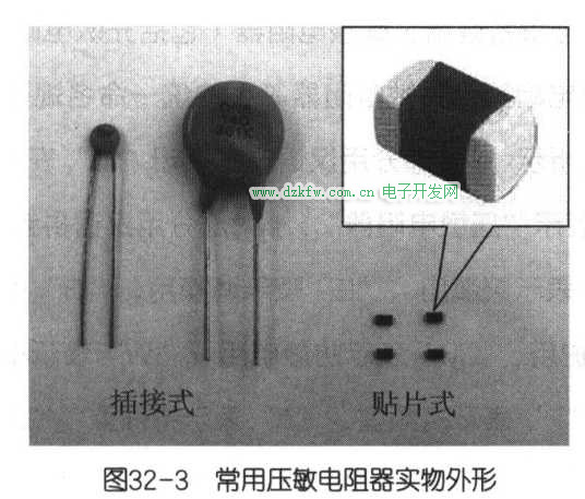 常见压敏电阻器外形比较单一,如按安装方式不同区分,可分为图32-3所示的插接式和贴片式两大类。大多数插接式压敏电阻器的外形与高压圆片形瓷介电容器的外形非常相似,区别在于压敏电阻器的扁圆片往往显得稍厚一些。