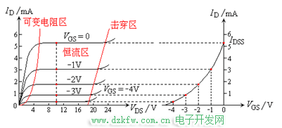 结型场效应三极管的特性曲线有两条,一是输出特性曲线(ID=f(UDS)|UGS=常量),二是转移特性曲线(ID=f(UGS)|UDS=常量)。N沟道结型场效应三极管的特性曲线如图2所示。