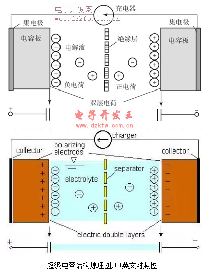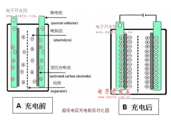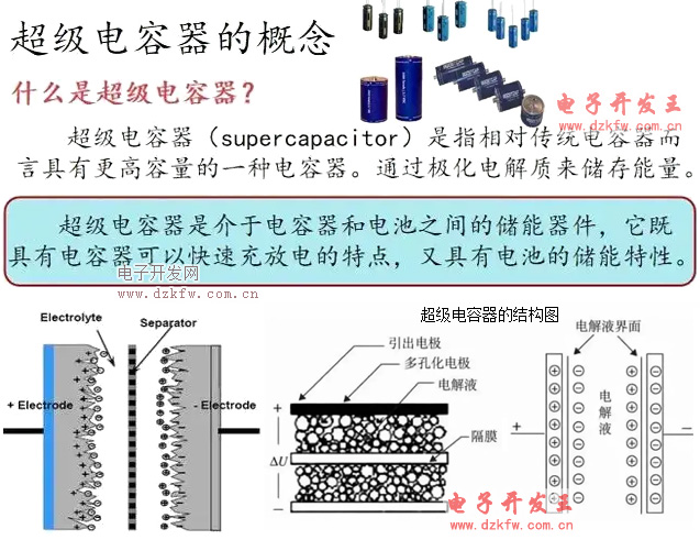 超级电容器工作原理超级电容器基本原理和其它种类的双电层电容器一样,都是利用活性炭多孔电极和电解质组成的双电层结构获得超大的容量。突出优点是功率密度高、充放电时间短、循环寿命长、工作温度范围宽,是世界上已投入量产的双电层电容器中容量最大的一种。
