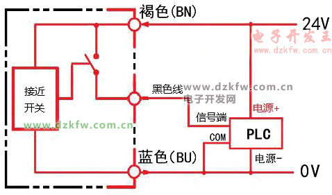 我在平时用万用表检测接近开关主要是检测它在电路工作中所输出的电压信号;另一种是在断电情况下测量接近开关信号输出端和电源接线端的阻值情况。我们常用的接近开关一般分为NPN型的和PNP型的,因此用万用表检测它的输出电压时要注意分清楚接近开关的三根线的性质,我们常见接近开关有三根线,它们分别是棕色线、蓝色线和黑色线,其中棕色线接直流24V电源正极;蓝色线接24V电源负极;黑色线是接近开关信号输出线。