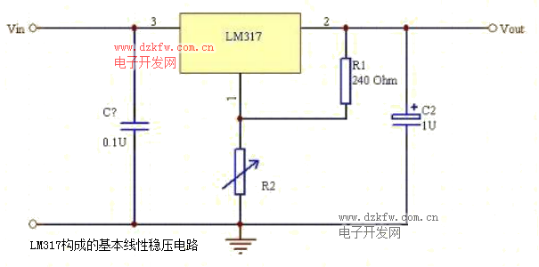 LM317是一款可调节输出正电压的稳压器,LM117使用简单,只需要两个外接电阻来设置输出电压,其线性调整率和负载调整率比标准的固定稳压器好,并且具有调压范围宽、稳压性能好、噪声低、纹波抑制比高等优点。