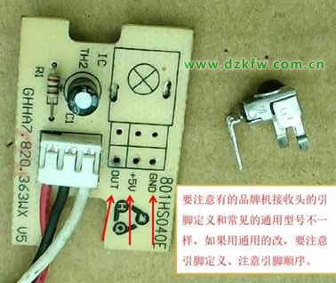 如果用通用接收头更换这些接收头的时候,注意通用接收头的VCC接线路板子上VCC,地对地,信号对信号,一般情况下,通用头也是可以代用这些品牌机的接收头的。
